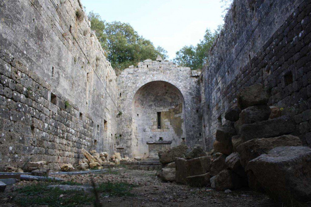 Dopo qualche decina di minuti lungo la strada nel bosco, dove incrociamo enormi ruspe cariche di legna appena tagliata, il viottolo inizia a sembrare a tratti scavato nella roccia, segno dell’antica frequentazione della via verso la rocca isolata di Castelvecchio. Dopo la salita del podere Il Caggio, un bivio sulla sinistra scende in direzione dello sperone su cui sorgeva l’antico castello: attorno agli alberi sono pieni di corbezzoli rossi carichi di passerotti e, ogni tanto, tonfi e sbuffi provenienti dalla macchia fanno pensare che i cinghiali sono decisamente numerosi! Lasciando alle spalle le rovine, che nella tradizione locale sono conosciute con il nome di Torracce, in una giornata grigia e indecisa tra la pioggia e il vento non è difficile comprendere la suggestione di una leggenda che vuole che Castelvecchio sia popolato da fantasmi dei suoi abitanti, sterminati dopo la conquista a tradimento di qualche vicino in armi.